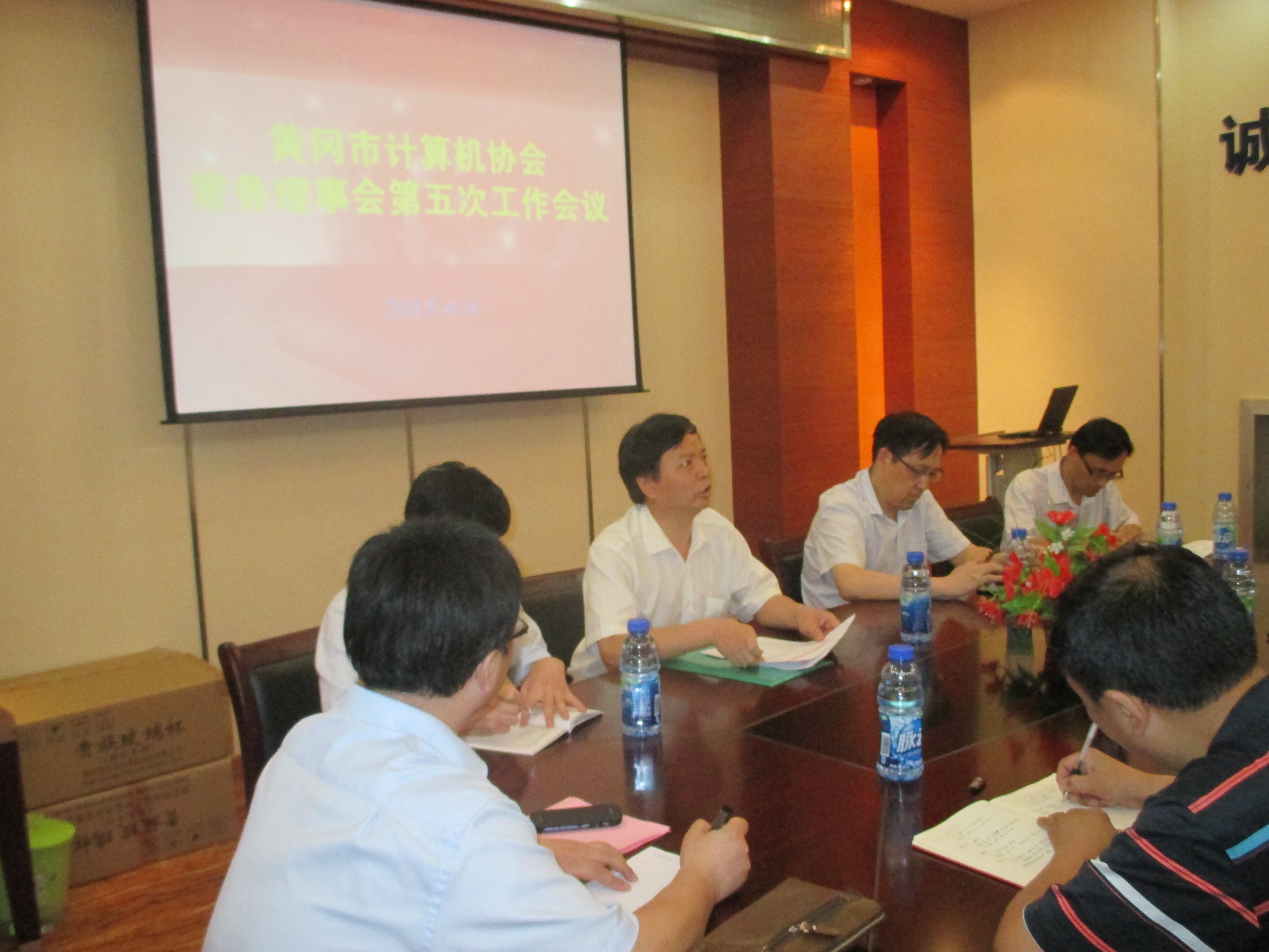 2015年6月6日,黄冈市计算机协会常务理事会第五次工作会议在中国建设银行黄冈市东门支行会议室召开。协会理事长彭锦、副理事长张青、熊发涯、王建宇和黄冈市科协会员部屈辉部长等共计18人参加了会议,会议由秘书长何中林主持。