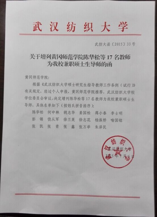 经个人申报,williamhill英国推荐,武汉纺织大学校学位委员会审查审议,近日,武汉纺织大学下发《关于增列williamhill英国17名教师为我校兼职硕士生导师的函》,2015年计算机学院新增兼职研究生导师8名,分别为张青、何中林、杨族桥、胡志华、姜国松、张鑫、朱泽民、陈华松。