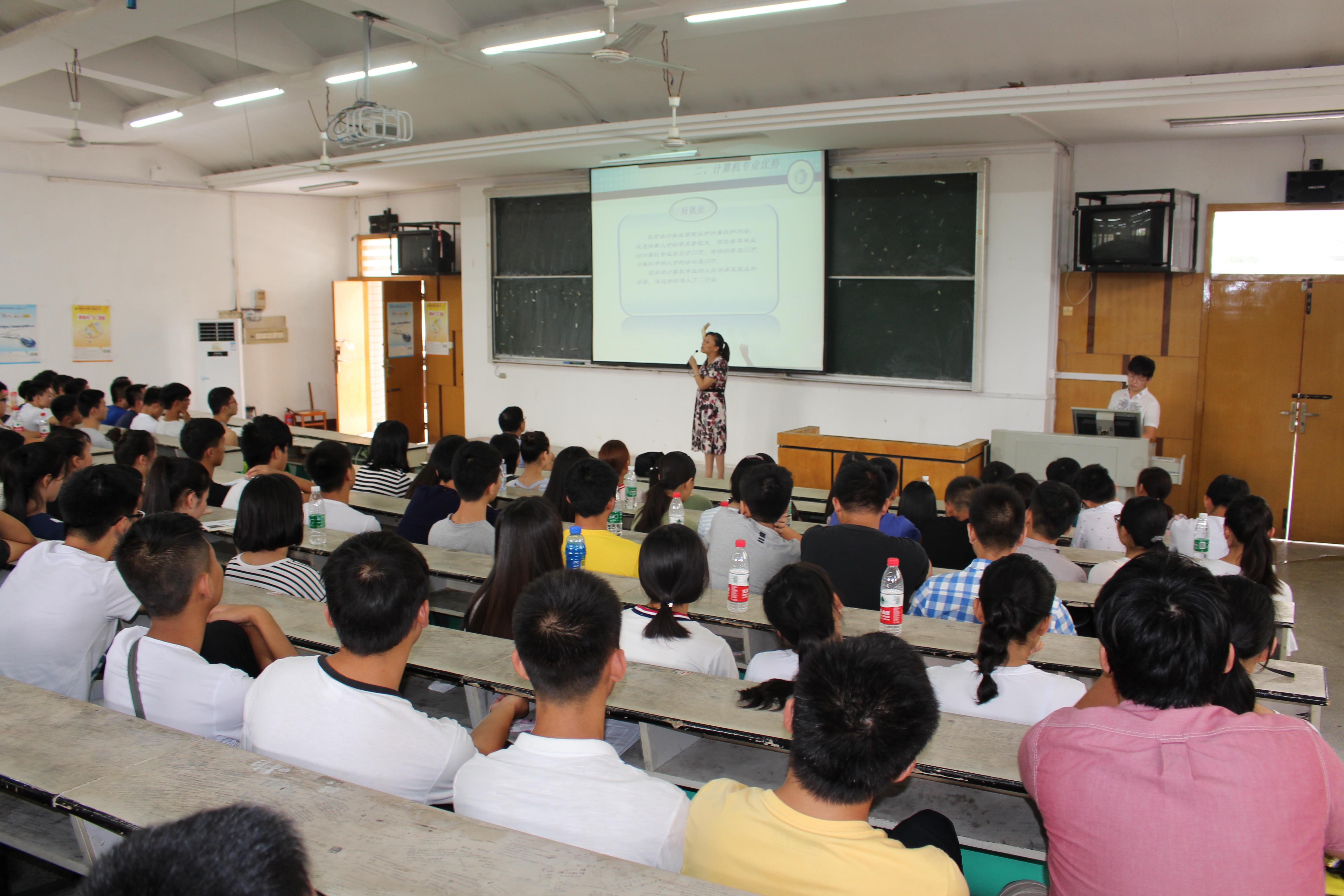 “金秋气爽,丹桂飘香。”9月5日下午,计算机学院2016年新生入学教育暨专业教育大会在南区主教B01隆重举行。计算机学院院长张青教授、党总支部书记何中林教授、副院长刘华教授、牛冀平教授、学院教师代表、学生工作人员及2016级全体新生参加本次大会。会议由陶筱平教授主持。