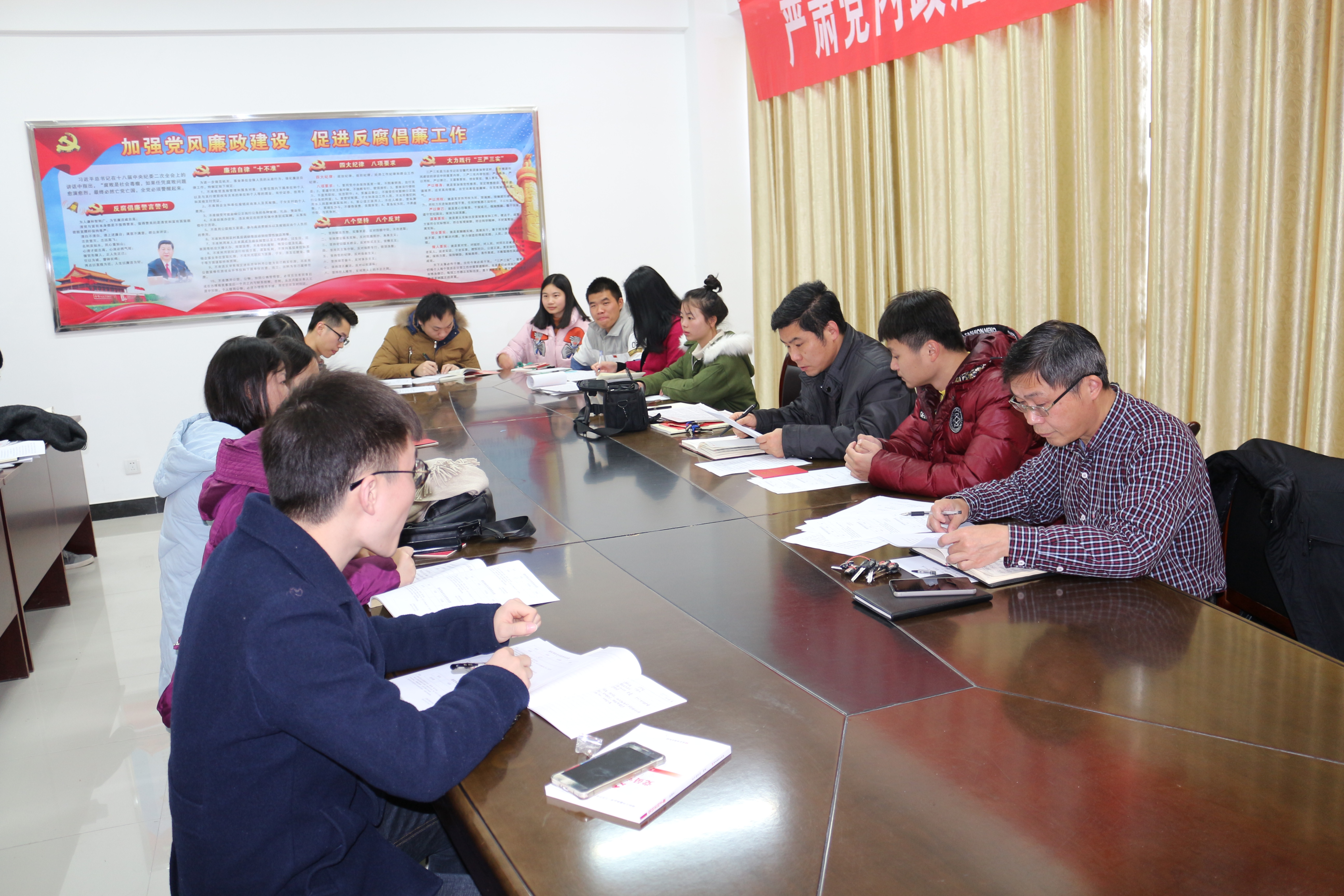 大会第三阶段在学生党支部书记陈劲松同志的带领下全体党员继续学习了《习近平总书记近期重要讲话精神》、《党章》、《中国共产党廉洁自律准则》和《中国共产党纪律处分条例》部分章节。。