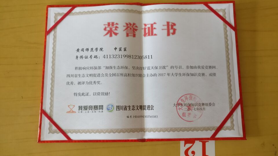 我院计算机应用专业201602班学生申茁茁积极响应环保部“加强生态环保,坚决打好蓝天保卫战”的号召,参加由我爱竞赛网、四川省生态文明促进会及全国百所高校组织联合主办的2017年大学生环保知识竞赛,并获得优秀奖。