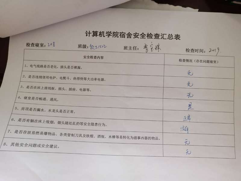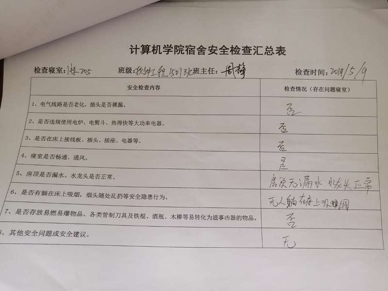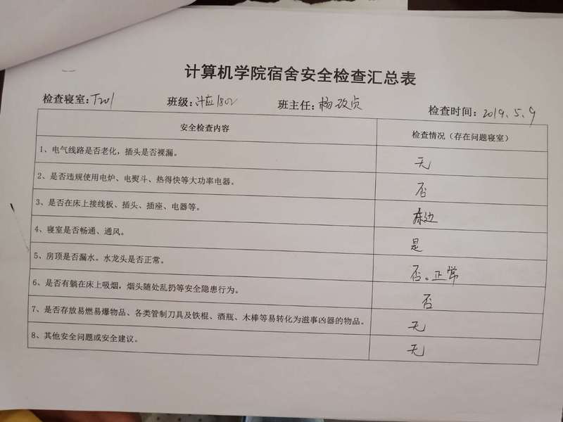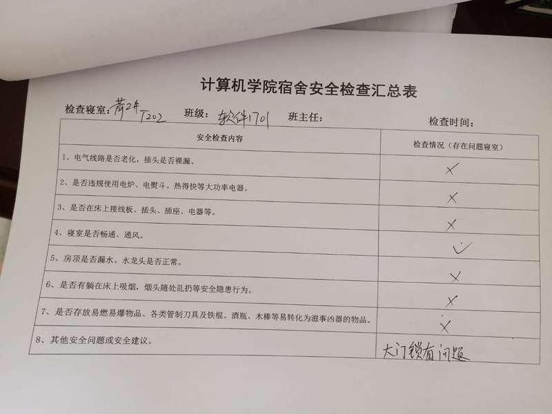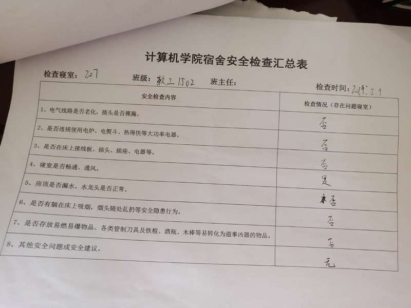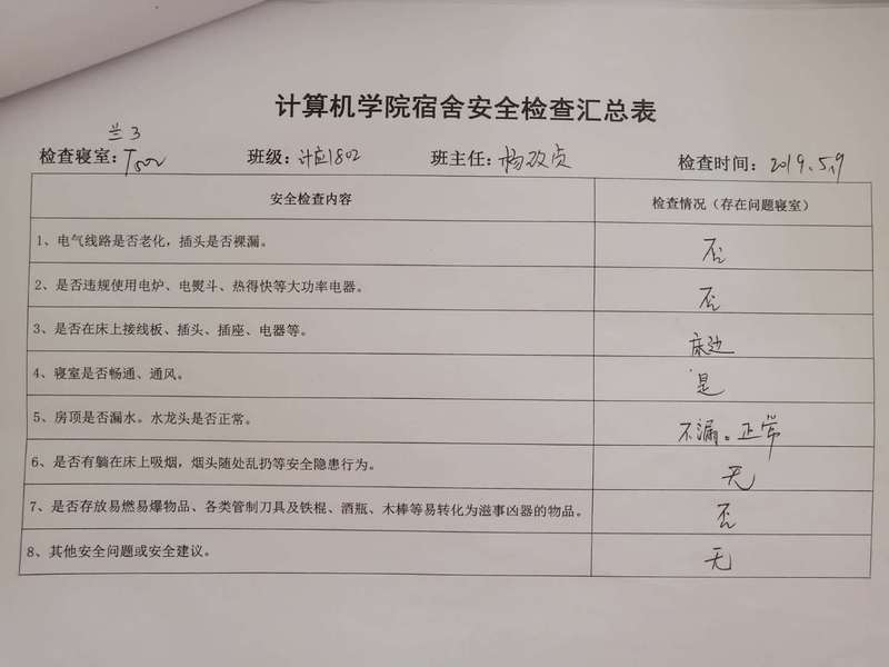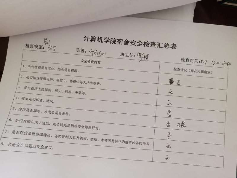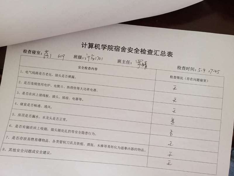 (2)考虑到查卫的实际情况,安全部于每周二通知各班做好准备,搞好寝室安