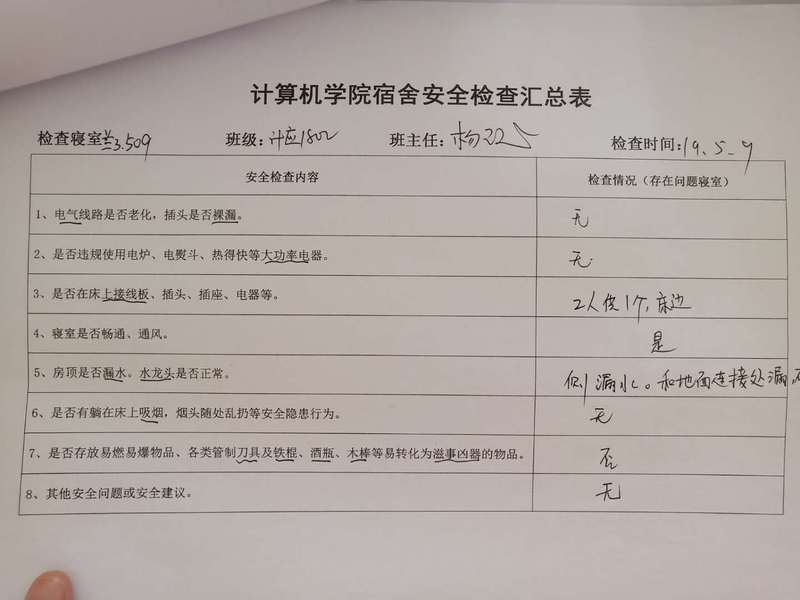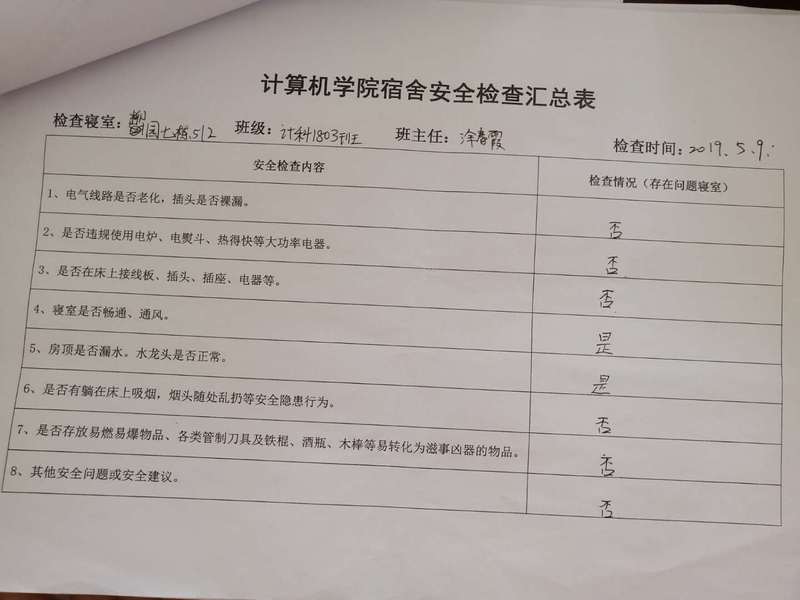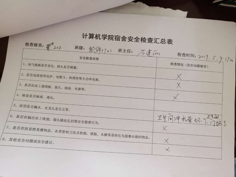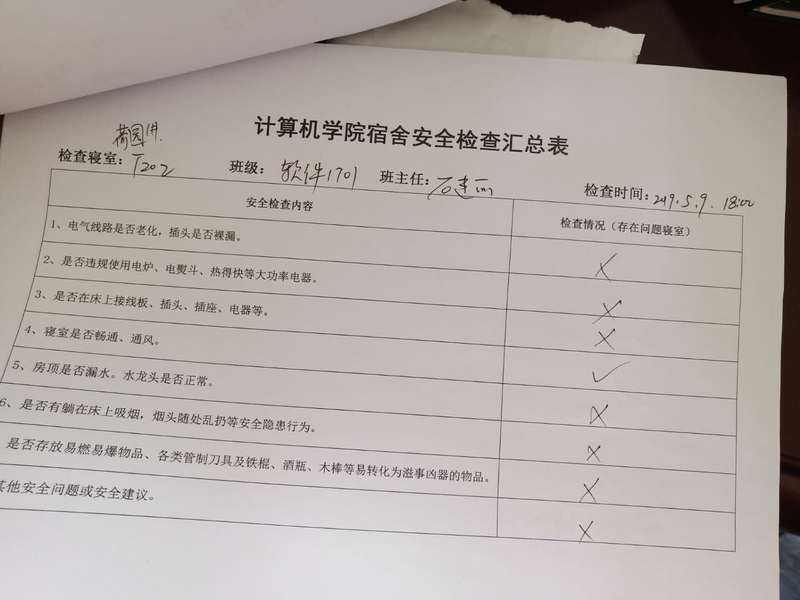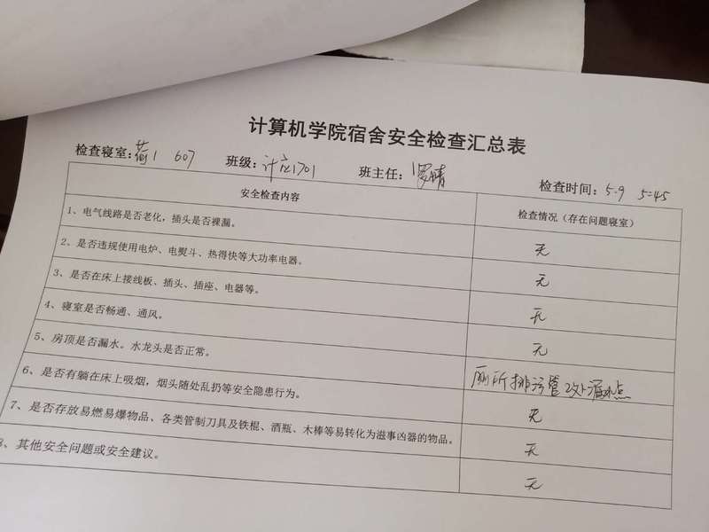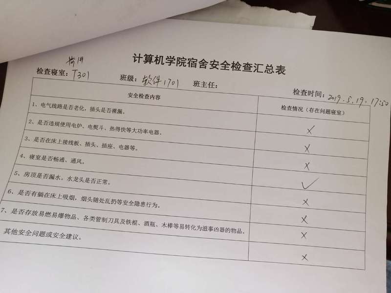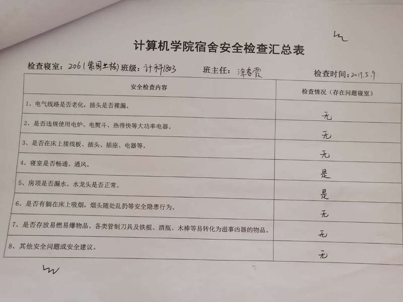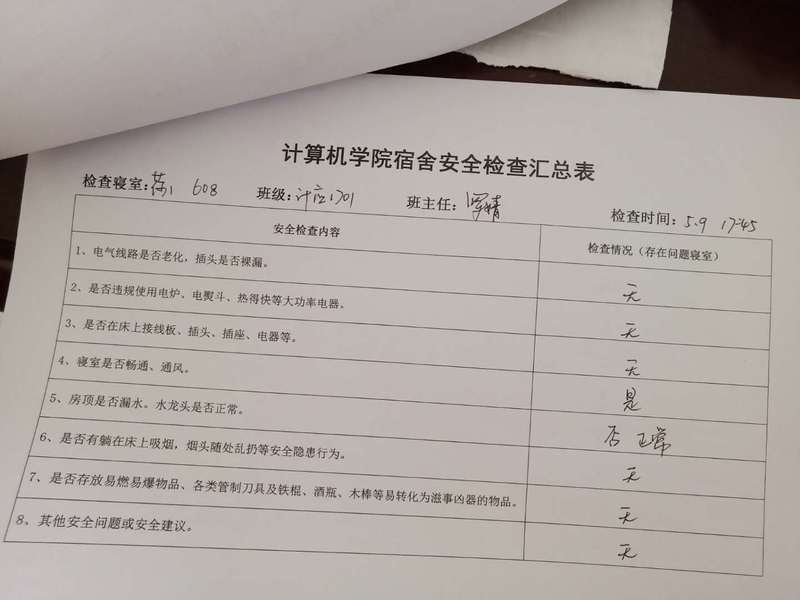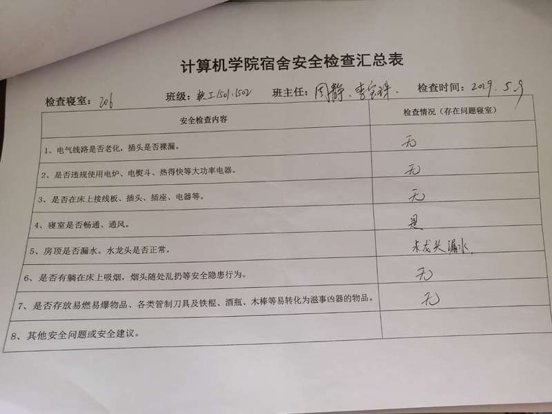 (2)考虑到查卫的实际情况,安全部于每周二通知各班做好准备,搞好寝室安