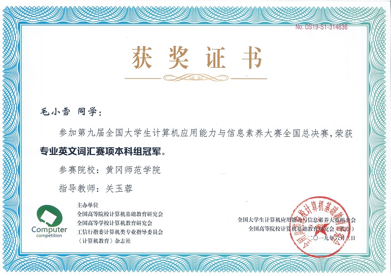 6月2日,第九届全国大学生计算机应用能力与信息素养大赛在首都经贸大学圆满落幕。我校学子获得一等奖3项,二等奖1项,三等奖9项。其中,我校计算机学院关玉蓉老师指导的学生毛小雪在专业英语赛项中荣获本科组个人一等奖、许元朋老师指导的学生黄晓彤在office商务应用能力赛项中荣获本科组个人一等奖、肖飞老师指导的学生冯鸿山在office商务应用能力赛项中荣获本科组个人一等奖,其中,毛小雪、黄晓彤同学分别在所参赛项中取得了第一名的优异成绩。