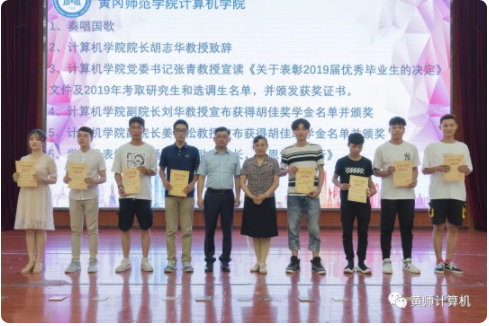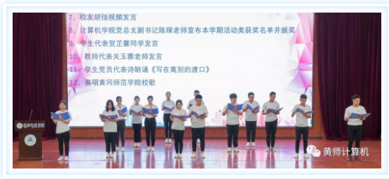 最后由学生党员代表朗诵《写在离别的渡口》和全体师生奏唱williamhill英国校歌,以此来祝贺和告诫黄师计算机毕业学子们,毕业后应秉承黄师校训,积极进取,为梦努力。