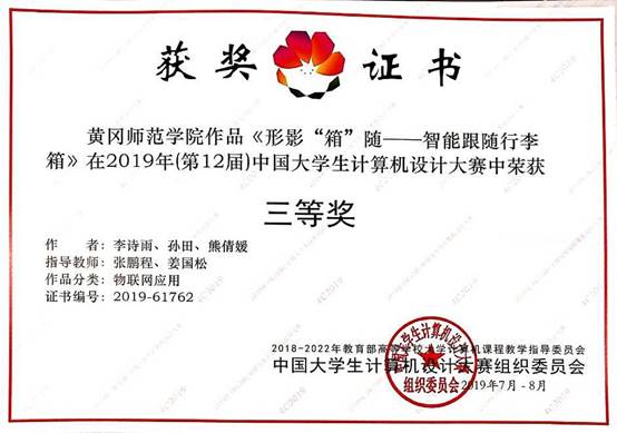 本网讯(通讯员 张鹏程) 2019年第十二届中国大学生计算机设计大赛物联网应用赛项于8月18日-22日在杭州电子科技大学下沙校区成功举办。在刚刚结束的比赛中,我校计算机学院物联网1701班李诗雨、熊倩媛、孙田组成的团队,设计制作的参赛作品《形影“箱”随-智能跟随行李箱》在入围决赛的281所高校推荐的579件作品中脱颖而出,荣获三等奖。
