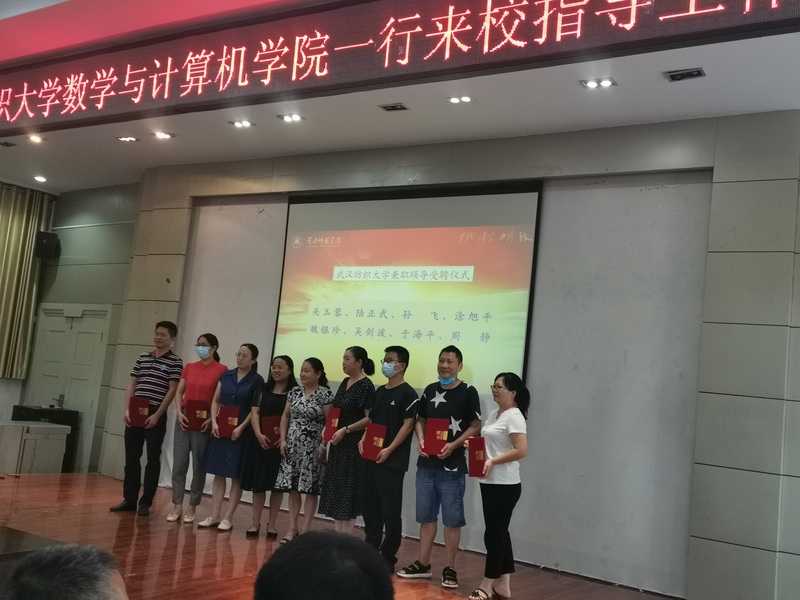 武汉纺织大学数学与计算机学院院长胡新荣为我院吴剑波、陆正武、涂旭平、魏银珍、于海平、关玉蓉、孙飞、周静八位教师授予武汉纺织大学兼职硕导证书。