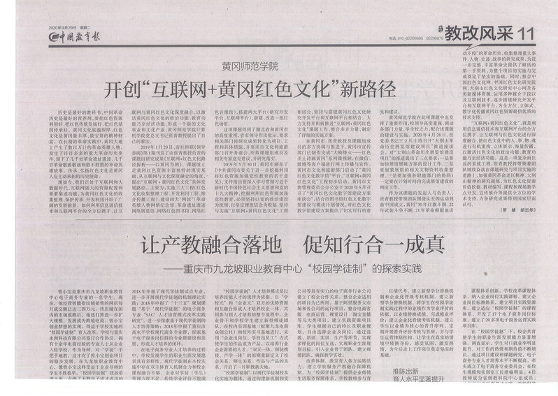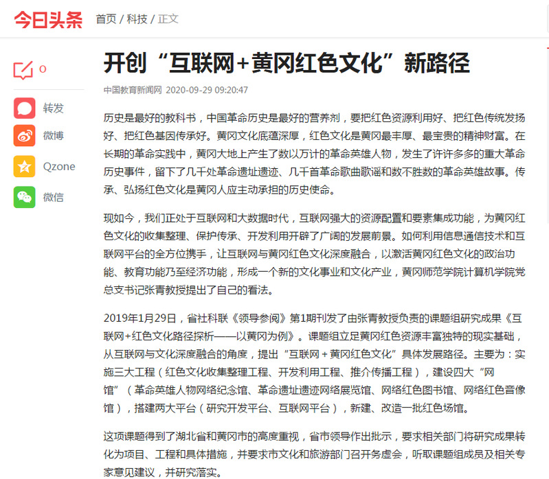 9月29日,《中国教育报》第11版以《williamhill英国开创“互联网+黄冈红色文化”新路径》为题,阐述了“互联网+红色文化”利用信息通信技术和互联网平台的全方位携手,让互联网与红色文化进行深度融合,使红色文化中的人、事、物、魂进行有机重构、立体展示、海量传播,以激活红色文化的政治功能、教育功能乃至经济功能。张青教授及课题组成员立足黄冈革命老区精神、大别山精神的研究提炼,为红色文化资源价值挖掘、教材编写、课程和现场教学点开发、宣传推介等提供全方位的学术支持,力争研究成果得到国家层面认可。