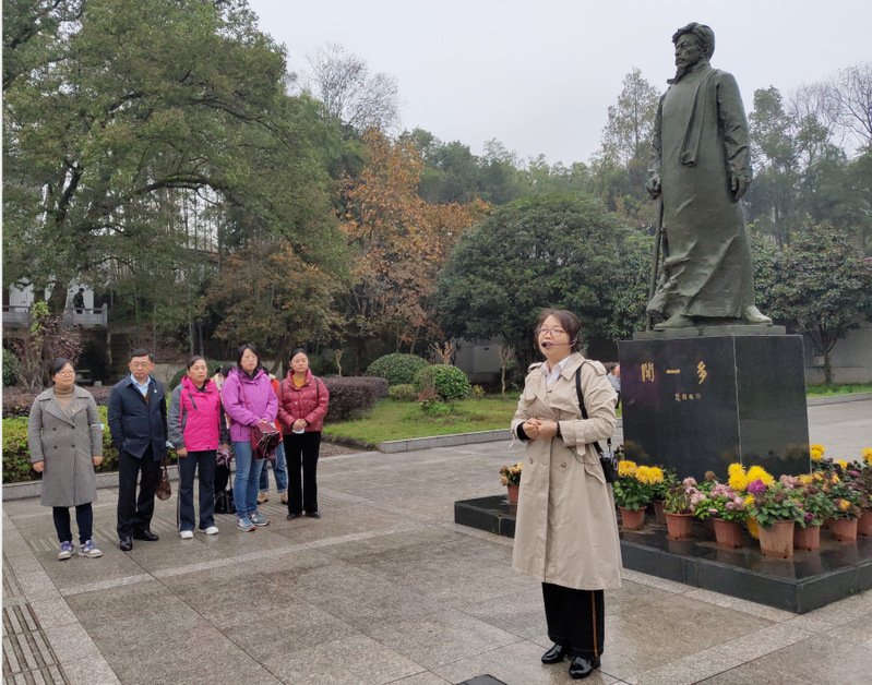 在闻一多纪念馆,全体党员先后参观了纪念馆实物陈列室、闻一多生平事迹简史、碑廊三个展厅。面对闻一多先生画像,齐声诵读《红烛》,吟唱《七子之歌》,不禁惊叹着闻一多先生的博学多才和义无反顾的爱国情怀,纷纷表示红烛不惜牺牲、无私奉献的精神是闻一多先生一生的写照。
