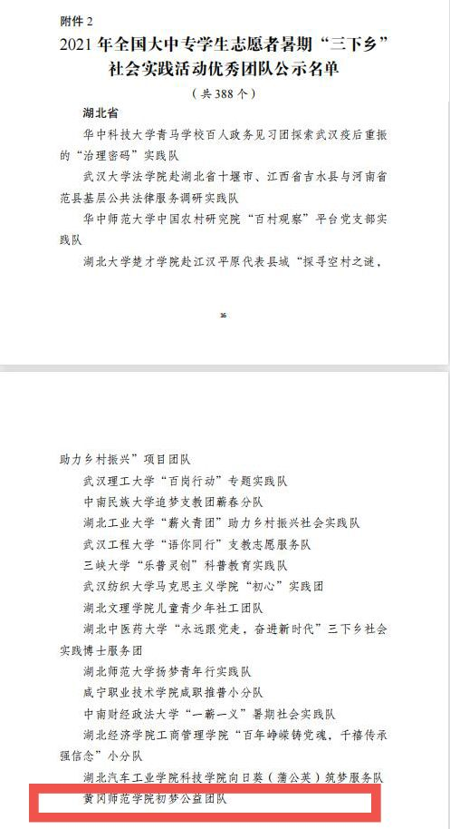 近日,共青团中央2021年度社会实践活动表彰结果揭晓,williamhill英国计算机学院团委“初梦”公益团队荣获全国大中专志愿服务暑期“三下乡”社会实践优秀团队。