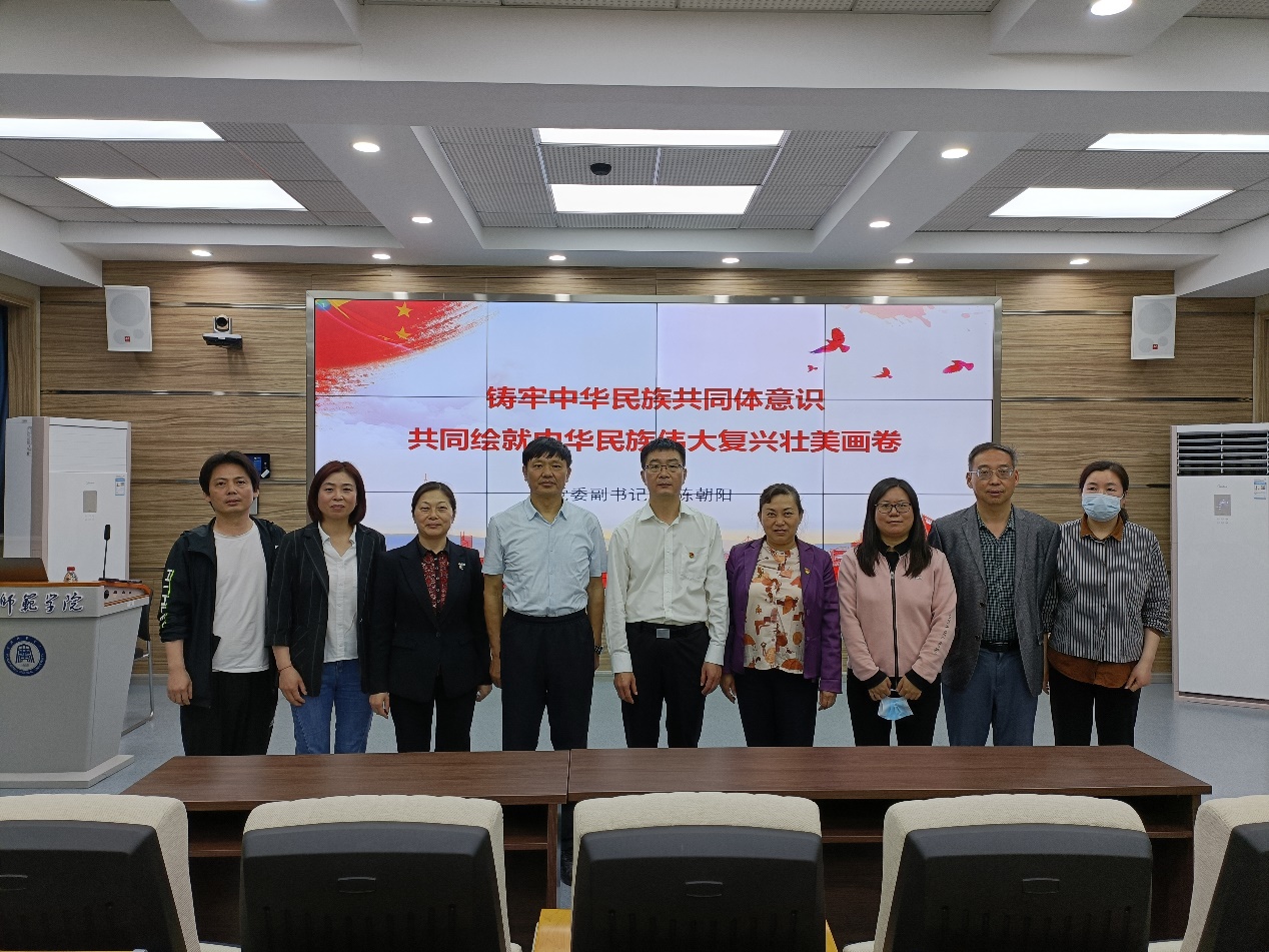 陈朝阳书记以《筑牢中华民族共同体意识 共同绘就中华民族伟大复兴壮美画卷》为主题分三部分展开教学工作。通过讲解“团结之源:深刻把握中华民族多元一体的基本国情”“变化之巨:全面认识民族团结进步事业的伟大成就”“长远之治:推动新时代党的民族工作高质量发展”三部分,引导学生增强爱国意识并进一步更好地爱党爱国爱社会主义,不断引领我院广大青年学子更加紧密地团结在以习近平同志为核心的党中央周围,增强“四个意识”、坚定“四个自信”、做到“两个维护”,号召同学们踔厉奋发、笃行不殆,为夺取全面建设社会主义现代化国家新胜利、实现中华民族伟大复兴的中国梦做出新的更大贡献。