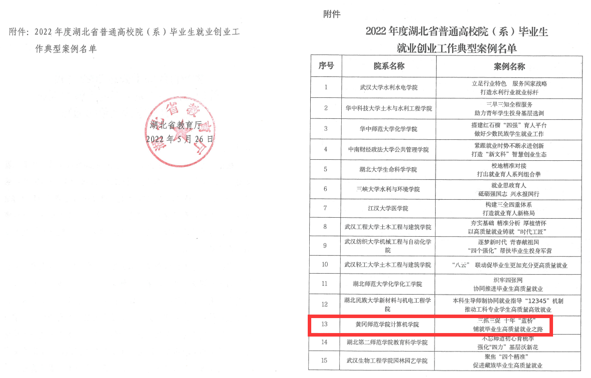 根据《省教育厅办公室关于开展普通高校院(系)毕业生就业创业工作典型案例征集宣传工作的通知》(鄂教学办函C2022] 1号)精神,我院认真总结经验做法, 打造就业创业工作品牌,全面促进毕业生高质量就业,我院毕业生就业创业工作案例《三抓三促 十年“蓝桥” 铺就毕业生高质量就业之路》获评湖北省教育厅2022年度普通高校院(系)毕业生就业创业工作典型案例。