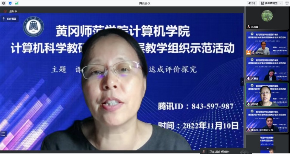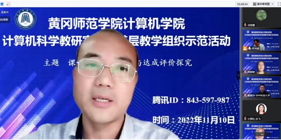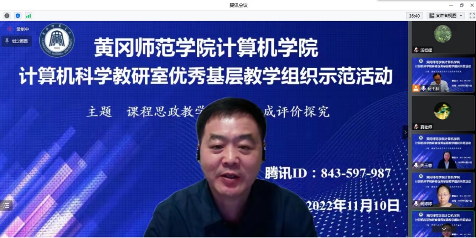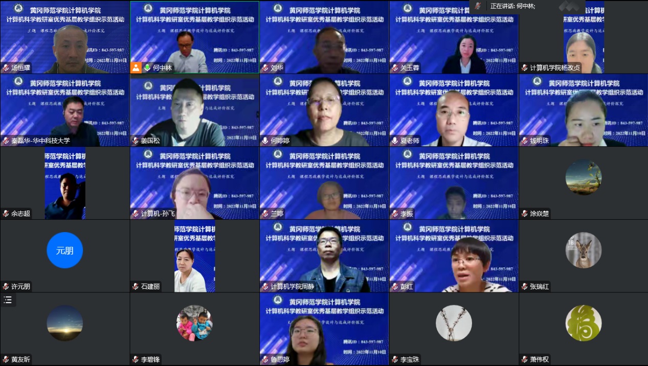 在williamhill英国首届本科教育教学节活动期间,计算机学院于11月10日晚通过线上形式成功举办计算机科学教研室优秀基层教学组织教学研究与交流示范活动,活动主题是“课程思政教学设计与达成评价探究”。参加活动的校外专家有华中科技大学计算机学院秦磊华教授、华中师范大学计算机学院何婷婷教授,学校领导与老师有校党委常委、副校长夏庆利教授、教务处副处长童三红教授、计算机学院班子成员及全体教师,会议由计算机学院院长何中林教授主持。