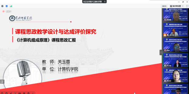 关玉蓉教授、钱明珠老师介绍课程教学过程中,课程思政总体设计、实施方案、教学评价与课程建设、存在的困惑等5个方面,分别汇报了《计算机组成原理》和《python编程技术》的思政建设经验、取得的成效,并提出了困惑问题供本次活动进行研讨。
