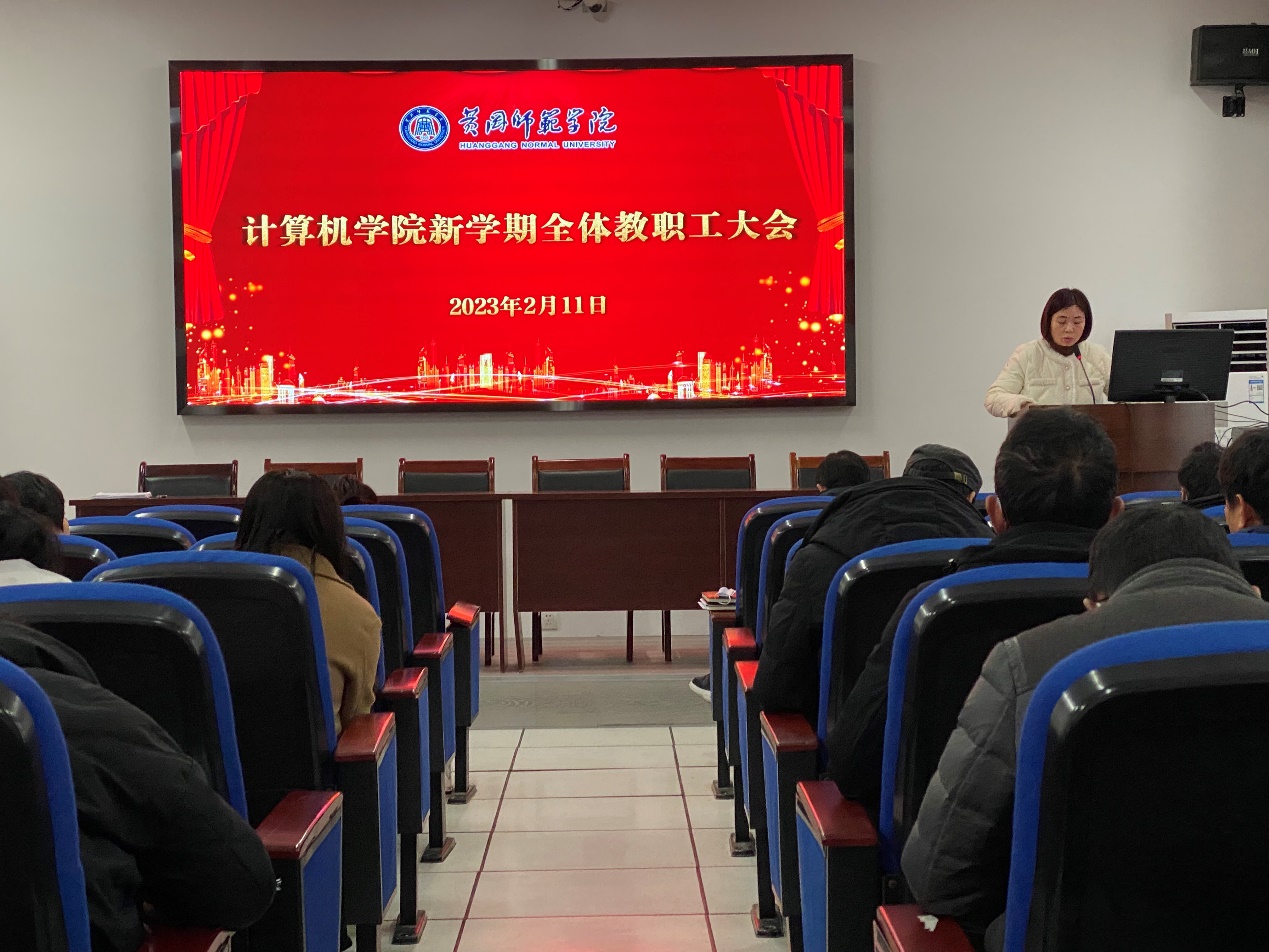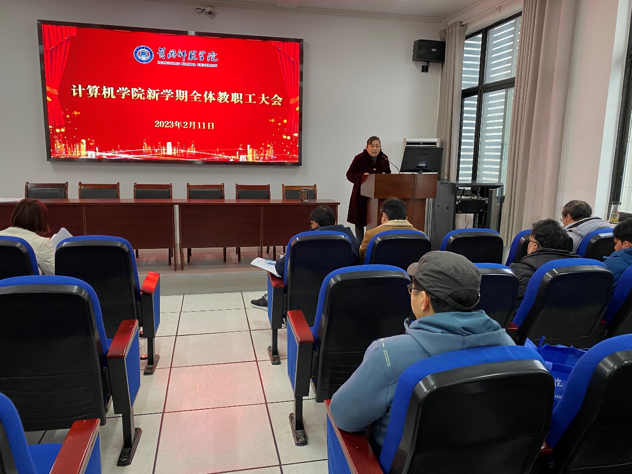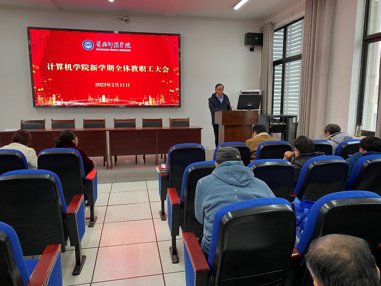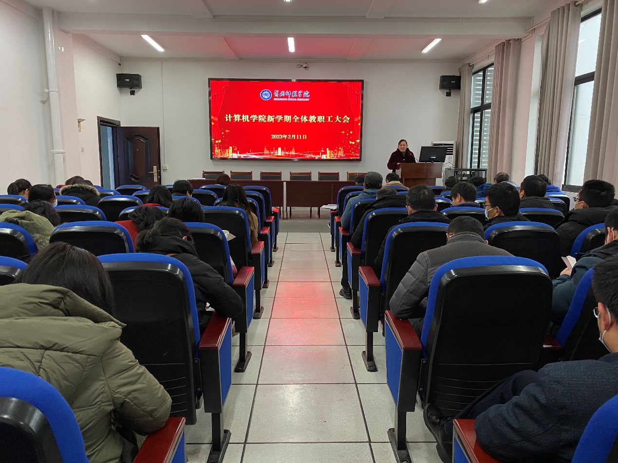 2月11日下午,新学期开学的第一天,计算机学院在逸夫楼308召开了2023年全院教职工大会,会议传达学习了学校相关会议精神,总结寒假工作,安排部署了新学期工作。学院全体教职工参加了会议,会议由学院党委书记张青主持。