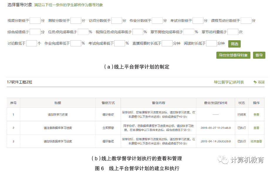 其中线上评分主要由教师设定评价因素,平台对学生实施动态衡量。教师综合学生线上学习情况,设定侧重点筛选督导对象并建立督学行为,由平台动态向学生发送督学通知。通过线上平台的支撑,逐步完善学生学习过程监测、评估与反馈机制,帮助教师了解学生学习的总体和个性化情况,并给予单独指导。线上教学效果如图5、图6所示。