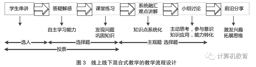 通过教学过程中的摸索,可以采用学生串讲、小组讨论等方式,鼓励学生主动思考和发散性思维,培养学生的自主学习能力、分析和解决问题的能力,在问题的分析和解决过程中,通过提出问题—讨论(分析问题)—解决问题—再提出问题的几次迭代,加深学生对基础知识的理解和对重点难点的认识和应用。在教学过程中结合线上教学平台,如雨课堂、蓝墨云班课、对分易、超星学习通等,改学生“举手”为“举手机”,实现老师与学生,学生与学生之间的全员互动。具体实施流程如图3所示。