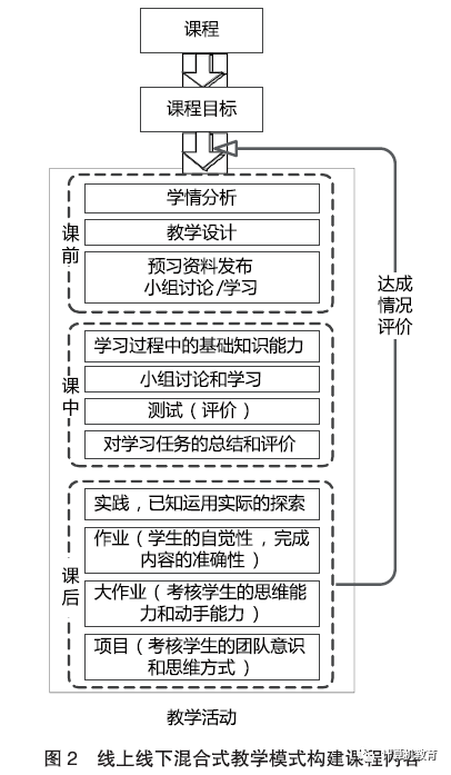 根据布卢姆的教育目标分类学中对认知领域的6层划分:认知、理解、应用、分析、综合和评价[8],线上教学侧重认知和理解,教师通过导学视频、学生分组讨论等方法进行课前导学,学生能够自主选择学习策略,根据个人的时间和水平进行学习,可多次重复观看视频,直至完全理解。课后教师通过线上平台即时接收作业和测试的结果,并积极给予指导与反馈,促进个性化学习。根据以上理念,本研究将课程内容以混合式教学模式重新构建,如图2所示,其中在教学活动中虚线表示的活动内容一般在线上平台进行。