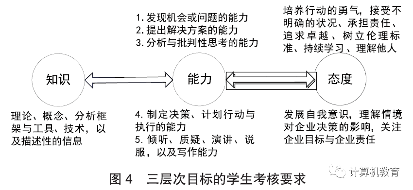 (3)形成多角度的课程质量监测,多方位的过程考核评价体系,提升自主学习能力。从学校、教师和学生3个不同的角度对课程教学质量进行多元监测,不仅表现为对学生学习效果的直接评价,而且体现学生对教学过程的满意程度,更加强调教学效果对学生发展的影响。学校层面贯彻“三段式”的教学检查制度,对检查出的问题给予反馈。教师层面根据“两性一度”的要求,调整考核内容和要求,从知识、能力、态度3个层面对学生提出了新的要求,如图4所示。