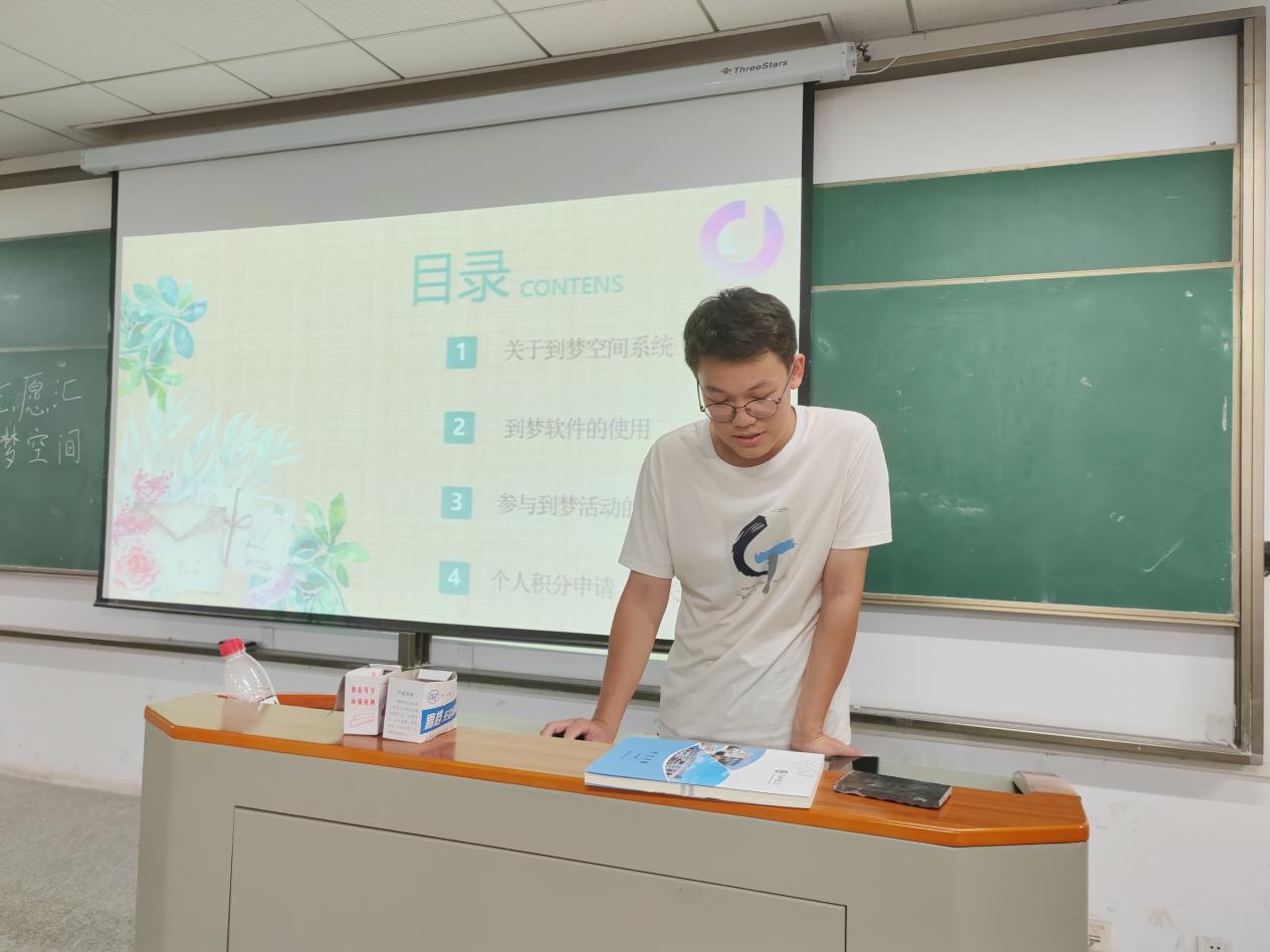 大会第三项,由院二课中心主任罗政为新生讲解到梦空间App的使用方法及要求。罗政同学从到梦空间系统、到梦空间软件的使用、参与到梦空间的活动的相关细则、个人积分申请这四个方面向新生详细讲解了到梦空间App,为新生答疑解惑。