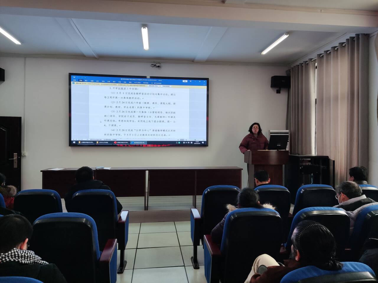 大会第二项,学院各分管领导布置开学初任务。党委副书记罗婧指出在开学初期,各班班主任应及时关注本班同学实际到校情况,要以学生安全为底线开展工作。在学生工作中要突出学院特色,打造学院特色品牌。副院长姜国松说明了学院本年度的科研工作任务及当前国家自科基金申报进度,鼓励各位老师积极申报软件著作权及专利,为建设专精特新产业学院做出贡献。副院长关玉蓉对寒假期间在校辛勤工作的老师表示诚挚的感谢,并就学院教学任务及课程材料进行了详细清晰的说明与指导。她表示学院要上下一心,凝聚共识,组建优秀的团队才能做出成果。院长助理汤恒耀就学院毕业论文工作进行了说明,指出所有指导老师应定期按时保质地对学生指导毕业论文,有针对性地给予学生指导建议和修改意见,切实做好毕业论文指导工作。
