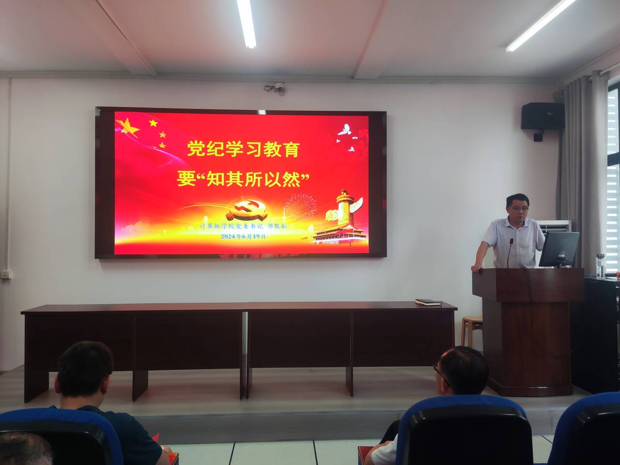 6月19日下午4点,为推动党纪学习教育走深走实,全面加强党的纪律建设,增强党员的纪律意识和规矩意识,计算机学院党委书记邓默耘于逸夫楼308会议室以《党纪学习教育要“知其所以然”》为题讲授党纪学习教育专题党课,学院党政班子成员、全体党员教职工参加学习。
