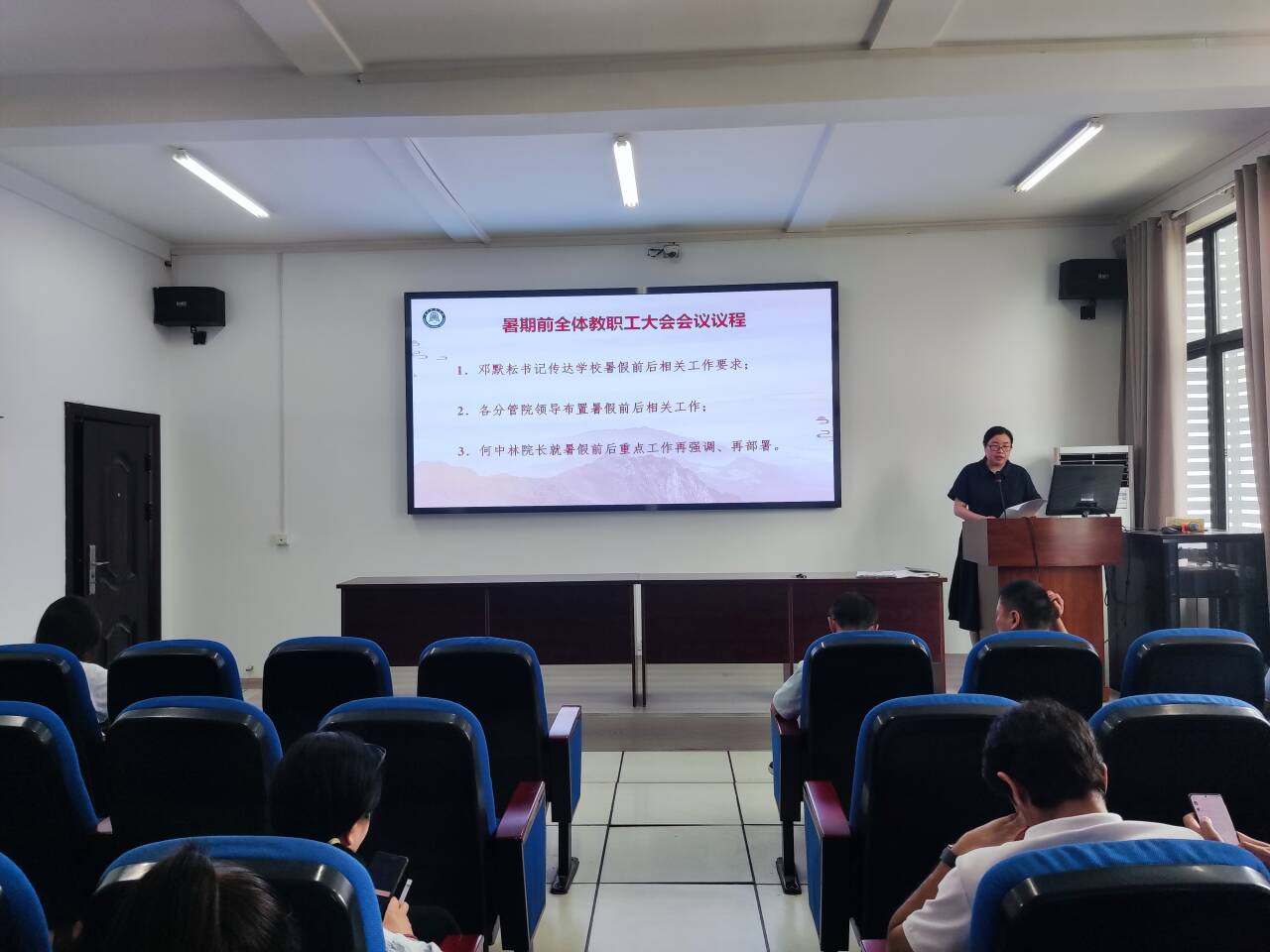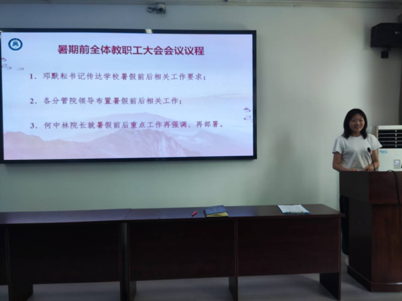 大会最后,何中林院长进一步强调了暑期办公室、实验室安全工作,并表示希望全体教职工团结一心,按照校党委要求,以学校部署的重点任务为引领,全面完成年终考核各项工作,并祝愿广大教职工能够劳逸结合,度过一个愉快、充实的暑假。