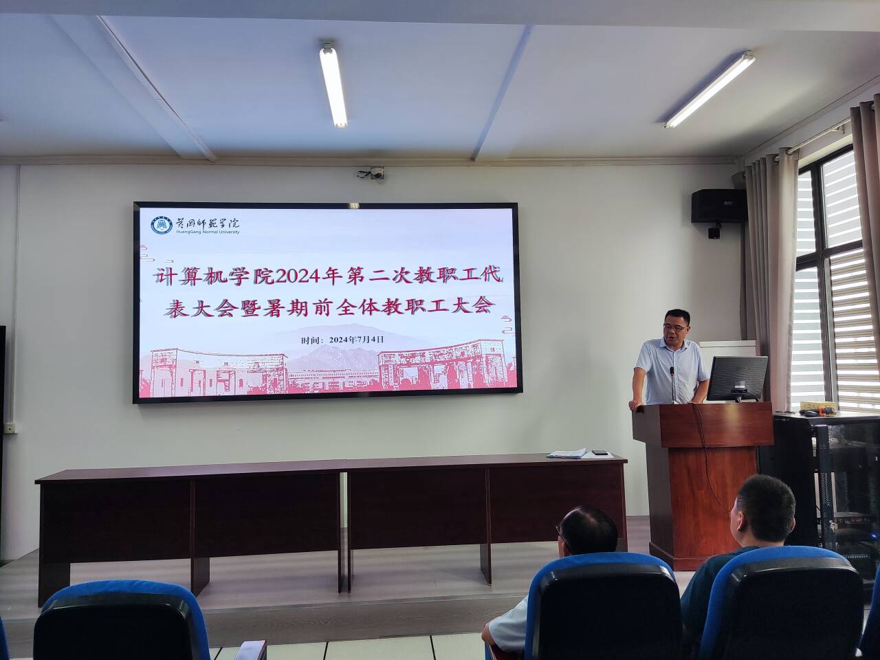 7月4日,计算机学院于逸夫楼308会议室召开2024年第二次教职工代表大会暨暑期前全体教职工大会,会议由学院党委书记邓默耘主持,全体教职工参加。