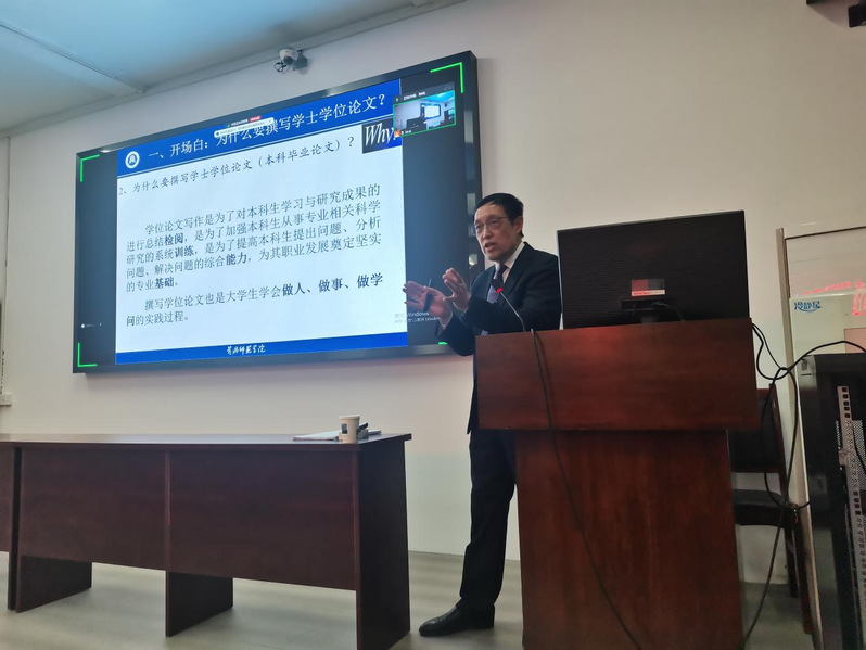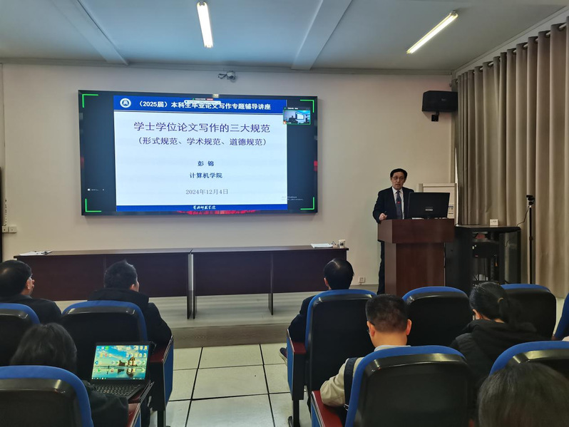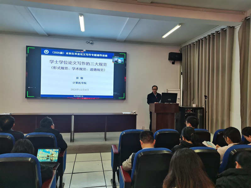 为进一步加强学院毕业论文指导工作,提高学生论文撰写质量,提升人才培养质量,计算机学院于2024年12月4日在逸夫楼308学术报告厅举办了2025届本科生毕业论文写作专题讲座,邀请了williamhill英国原副校长、湖北省首批二级教授、博士生导师彭锦进行题为《学士学位论文写作三大规范》专题辅导,会议由计算机学院院长何中林主持,学院全体毕业论文指导老师和2025届毕业生通过线下或线上的形式参加了本次专题讲座。