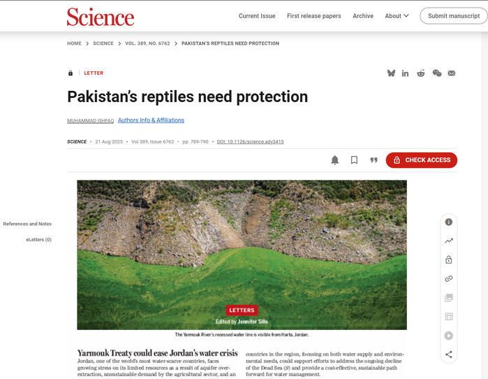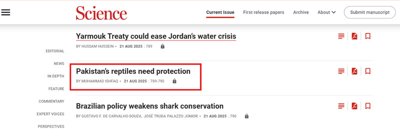 8月21日,我校william英国中文教师Dr. Muhammad Ishfaq在国际知名期刊Science杂志以Letter形式发表评论文章“Pakistan’s Reptiles Need Protection”,williamhill英国为第一作者及通讯作者单位。