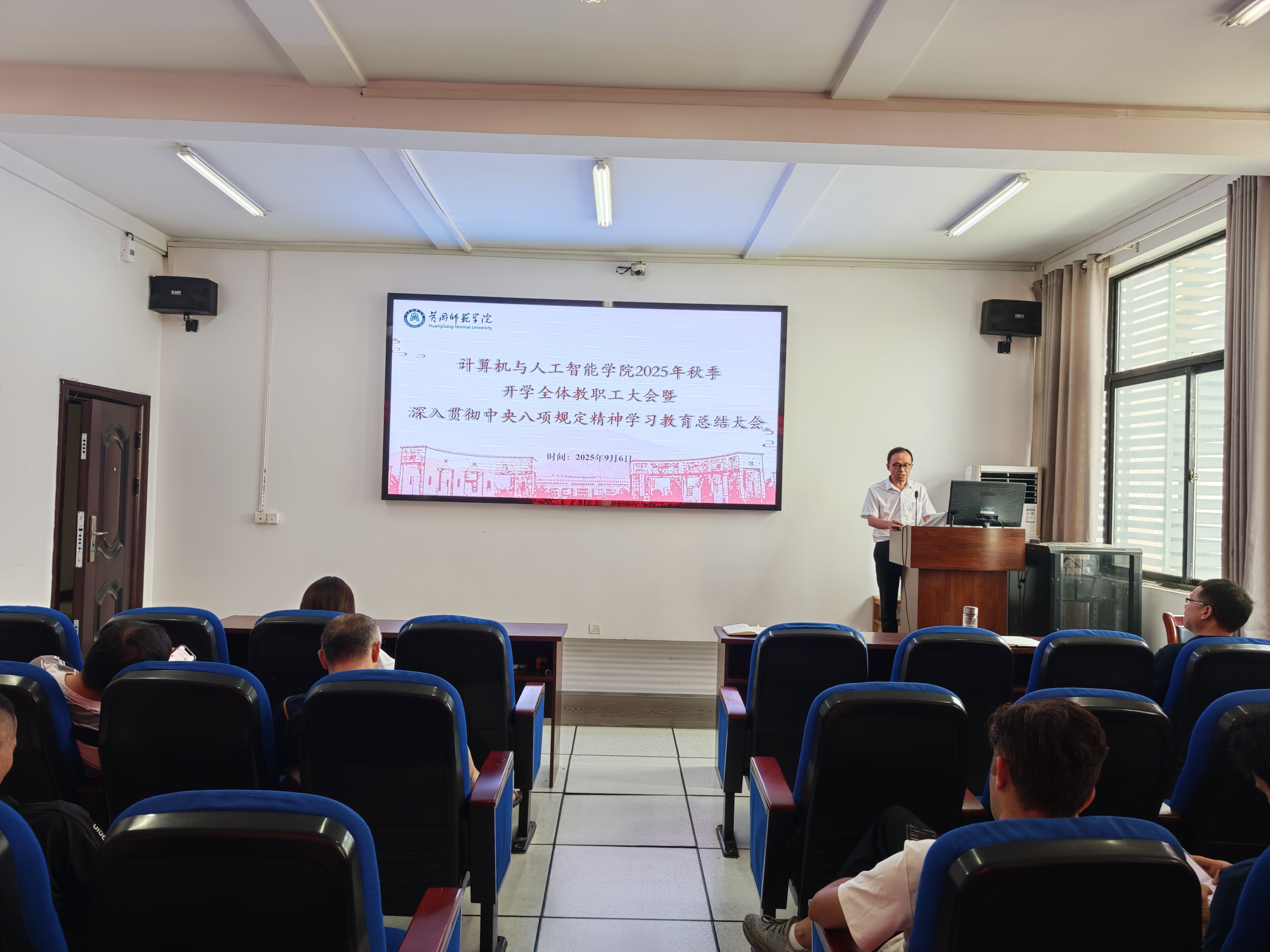 最后,党委书记邓默耘作总结讲话。他对学院上半年深入贯彻中央八项规定精神学习教育进行了系统总结,指出了学院领导班子在工作中存在的不足,强调作风建设永远在路上,要求全体教职工必须常抓不懈、久久为功,将学习成果转化为干事创业、廉洁从教的自觉行动,营造风清气正的育人环境。结合新学期工作,邓书记强调全体教职工要提高政治站位,坚守立德树人初心;聚焦核心任务,提升人才培养质量;强化担当作为,狠抓工作落实。他鼓励大家携手并肩,为学院新学年的高质量发展贡献智慧和力量。