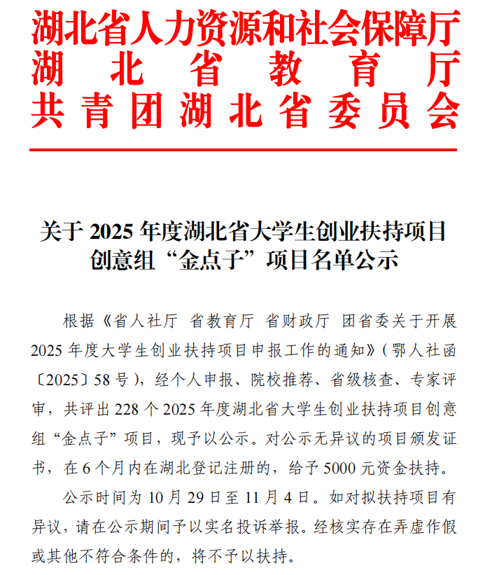 近日,湖北省人力资源和社会保障厅、湖北省教育厅与共青团湖北省委员会联合发布了《2025年度湖北省大学生创业扶持项目创意组“金点子”项目名单公示》。我院软件工程2301班刘伊同学负责的“战网砺剑——单对以太网高可靠传输链路”项目成功入选,充分展现出学院在创新创业教育与学生实践能力培养方面的积极成效。